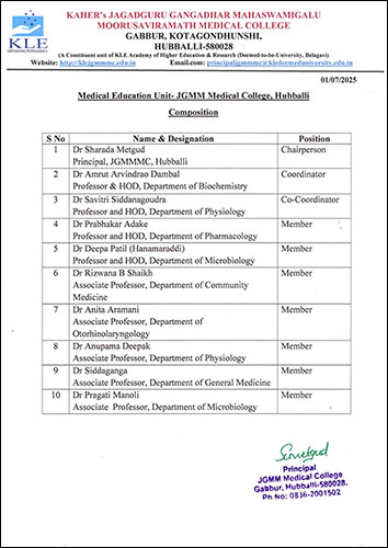 "A Full Fledged robust Medical Education Unit is established and is functioning at JGMM Medical College which is aimed to conduct various faculty development and training programs by holding Seminars/Workshops/Conferences/CME to train all the teaching faculty in newer teaching learning technologies in order to to impart proficient medical education to students and in turn the better patient care."